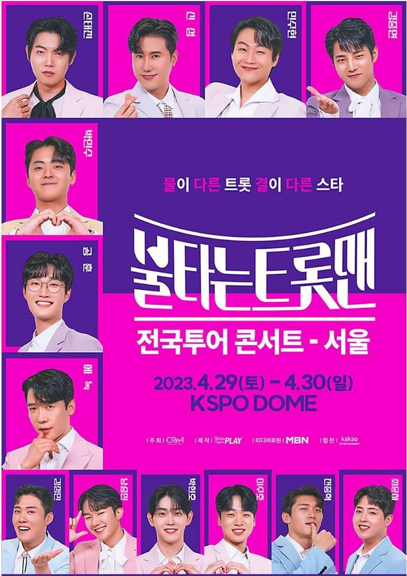 오늘은 불타는 트롯맨 콘서트 일정을 알려드리고자 합니다. 미스터 트롯과 양대산맥으로 불리었던 이 프로그램은 트로트 오디션 프로그램으로 손태진이 우승하면서 막을 내렸습니다. 최근 개인 이슈로 하차한 황영웅을 제외하고 13인이 참가하여 전국투어 콘서트를 연다고 합니다. 이슈가 많았지만 시청률이 16.2%나 기록할 만큼 많은 분들의 사랑을 받았던 프로그램이라 재밌게 보셨던 분들은 많이들 가실꺼라 생각이 됩니다.