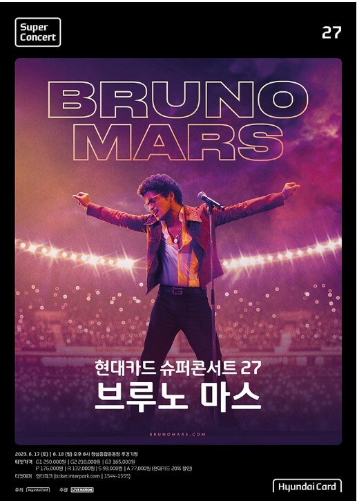 21세기를 대표하는 싱어송라이터 글로벌 팝스타 브루노 마스가 현대카드 슈퍼콘서트로 6월에 열립니다. 27번째를 맞은 현대카드 슈퍼콘서트는 2017년 콜드플레이에 이은 두번째 10만명 규모의 콘서트로 내한 공연으로는 역대 최대 규모입니다.